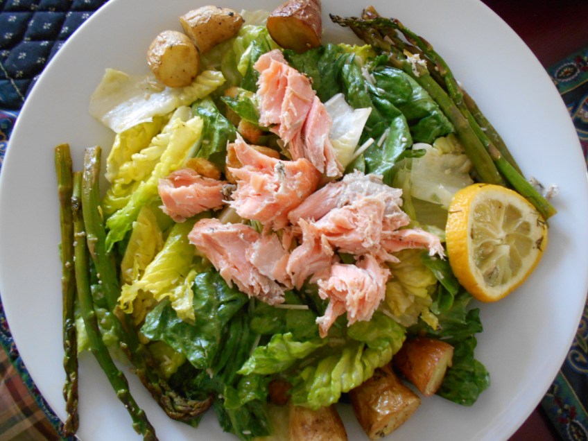caesar,salmon,asparagus,potatoes Published June 9, 2014 at 3648 × 2736 in The One Dish Oven Roasted Salmon with Asparagus, Fingerling Potatoes and Sliced Lemons