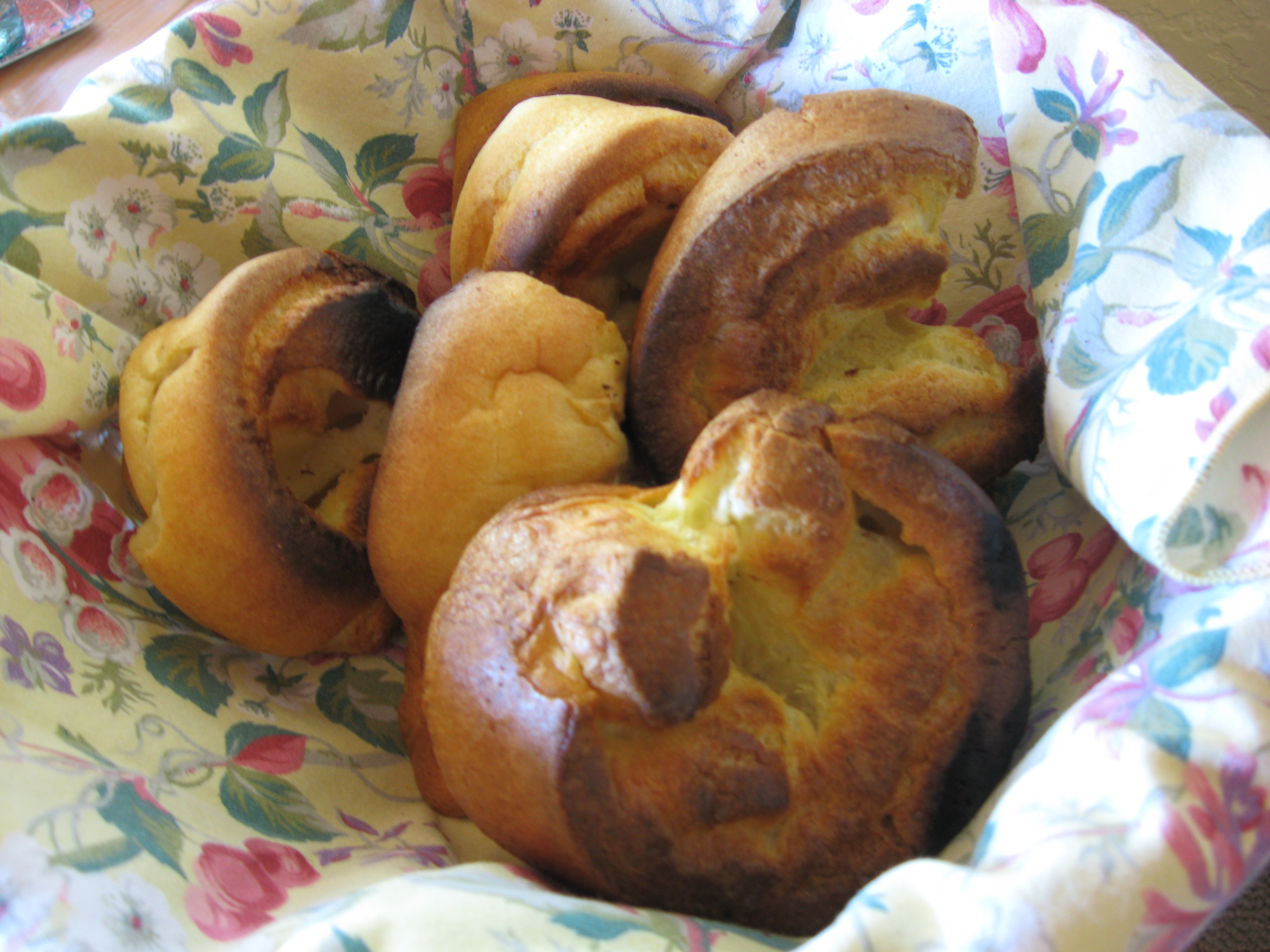 This is what I made this morning, day after the election.  It was so good and I had it with a bit of the crunchy peanut butter and plum jam–both of which I had made very recently.  When baking the popovers, I would strongly suggest using a Teflon muffin pan or to stick free spray your ramekins very thoroughly to get the popovers out with ease.